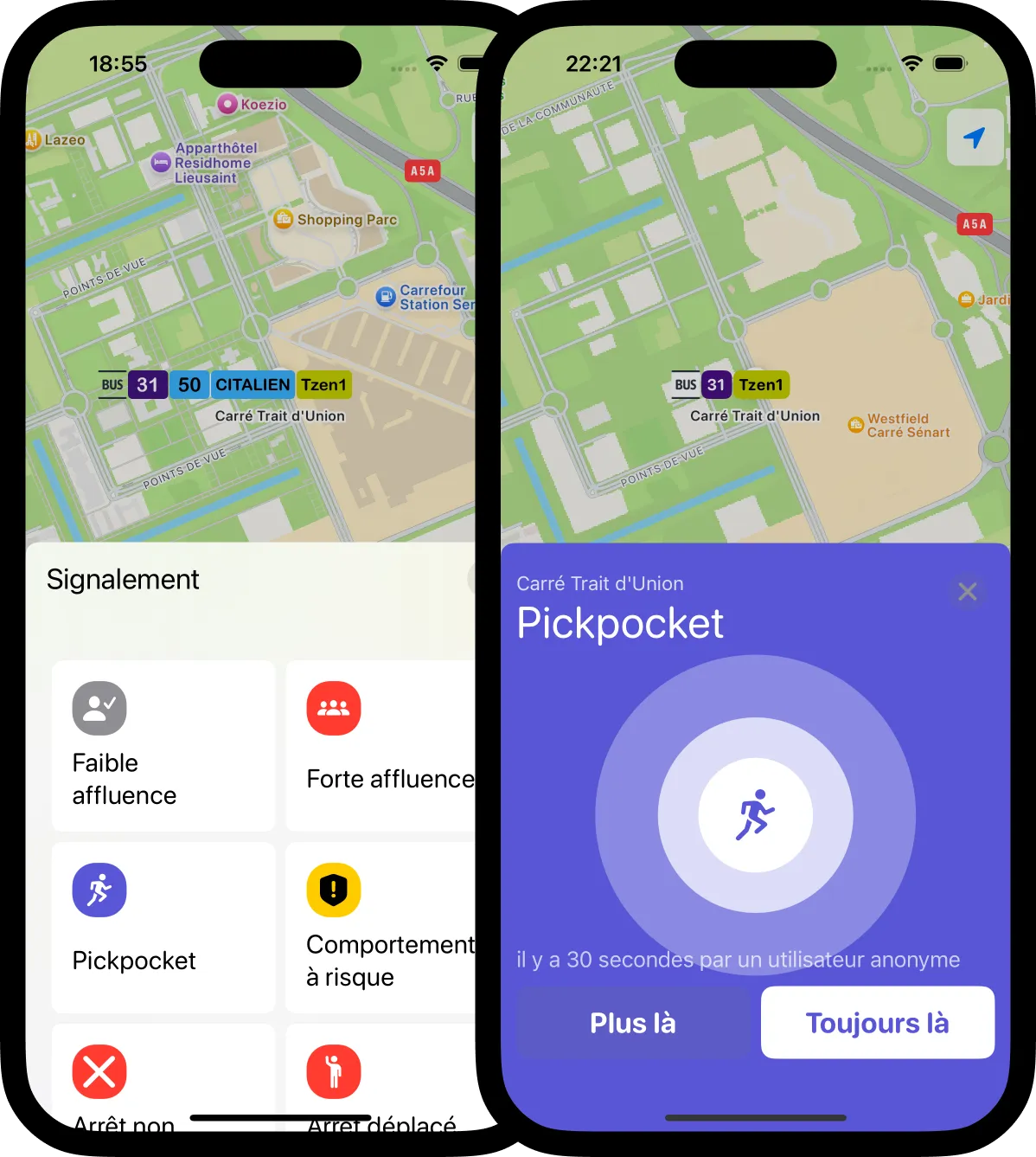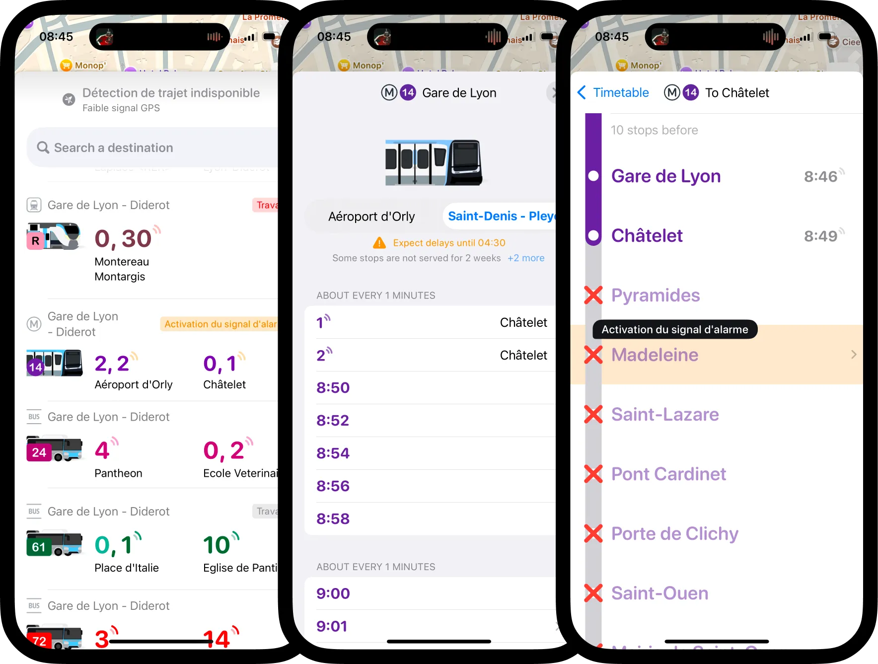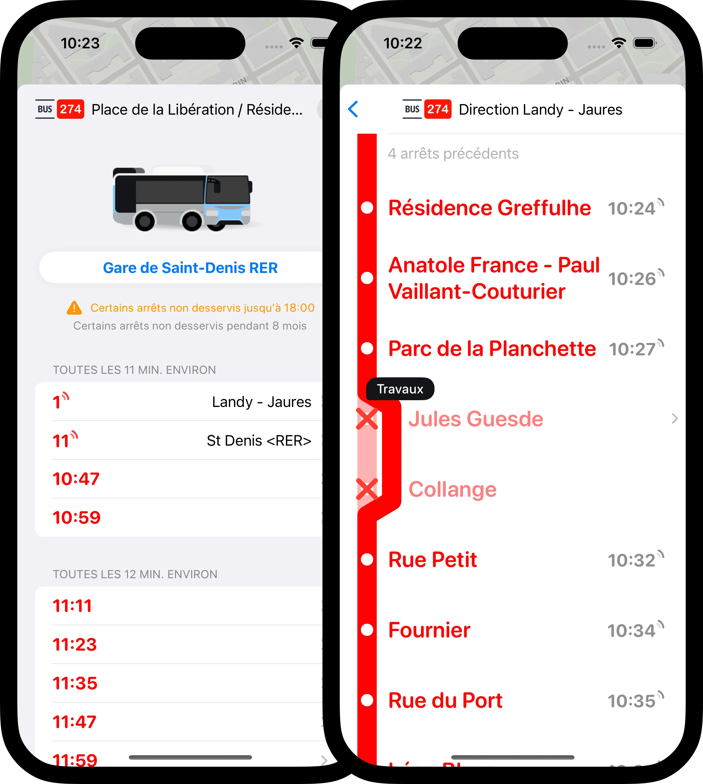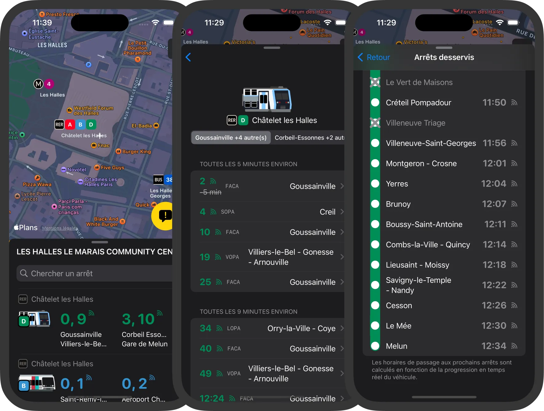 On ouvrant Wagon, toutes les lignes à proximité et leurs départs en temps réel sont affichés. En cliquant sur une ligne, on accède aux horaires de la journée pour les différentes destinations. Enfin, en cliquant sur un départ, on peut consulter les horaires de passage à chaque arrêt.