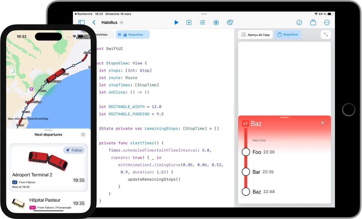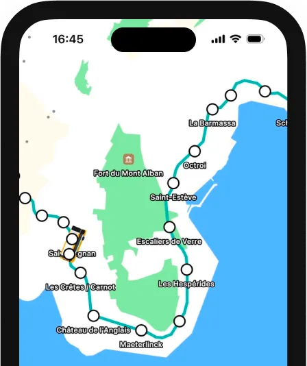 Halobus est une application hors ligne qui affiche l’ensemble du réseau de transports en commun de Nice, avec la position actuelle de tous les bus et tramways. Elle met en valeur l’étendue du réseau et invite les utilisateurs à explorer la ville sans voiture.